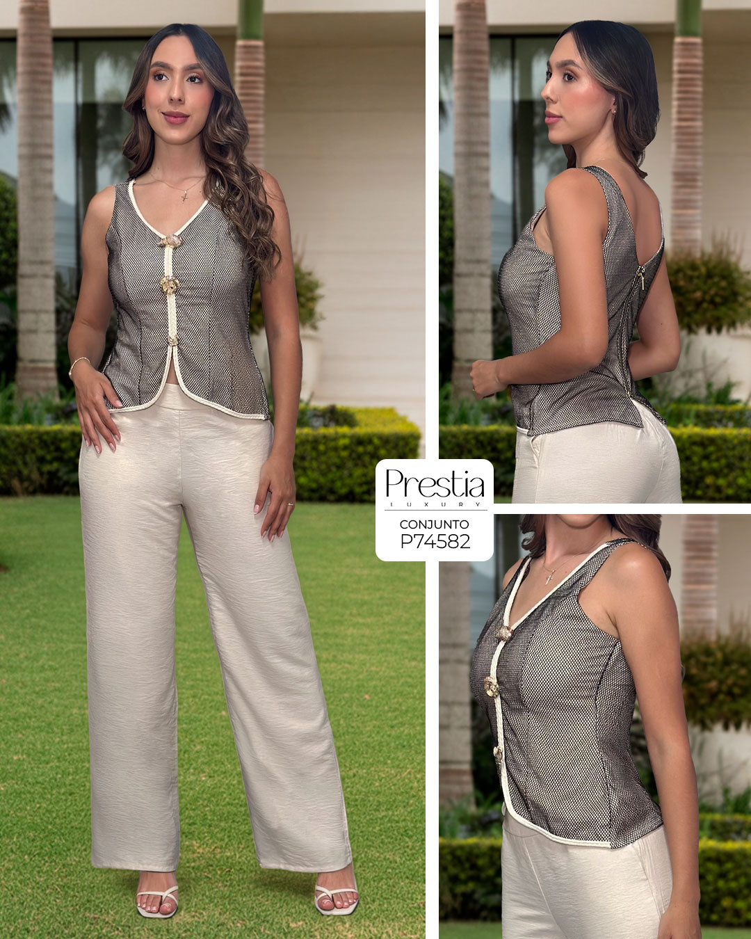 Conjunto Blusa Blusa tipo chaleco sin mangas en color crema. Elaborada en tela Flow Escote...