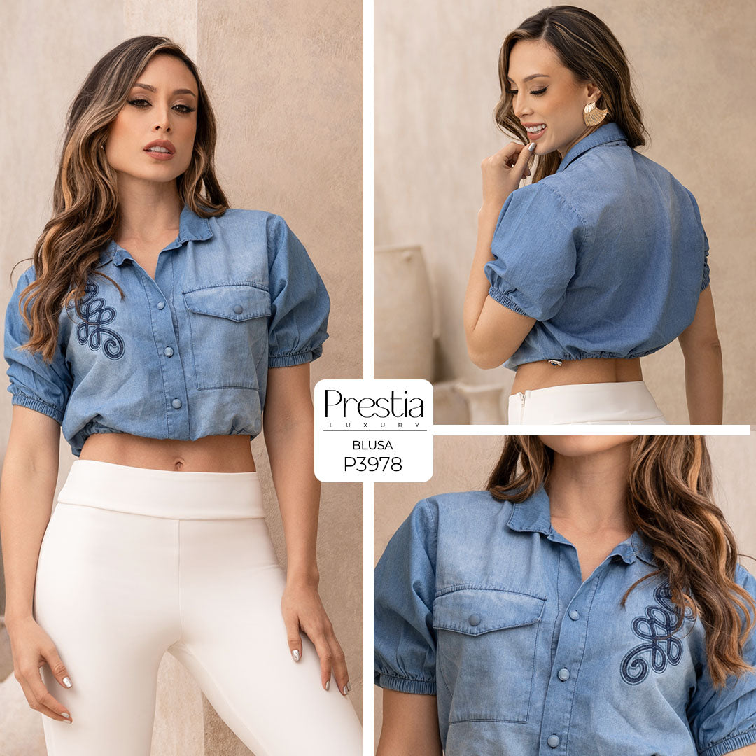 Blusa: Elaborado en tela chambray Color Azul Corte crop Diseño con resorte en la cintura...
