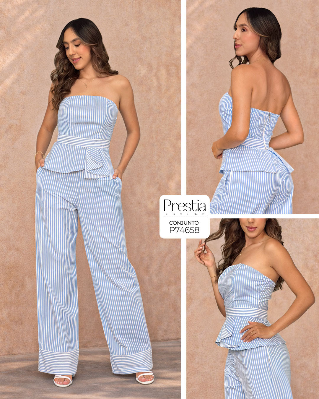 Conjunto Top Top strapless en tono celeste con rayas blancas que aportan un estilo fresco...