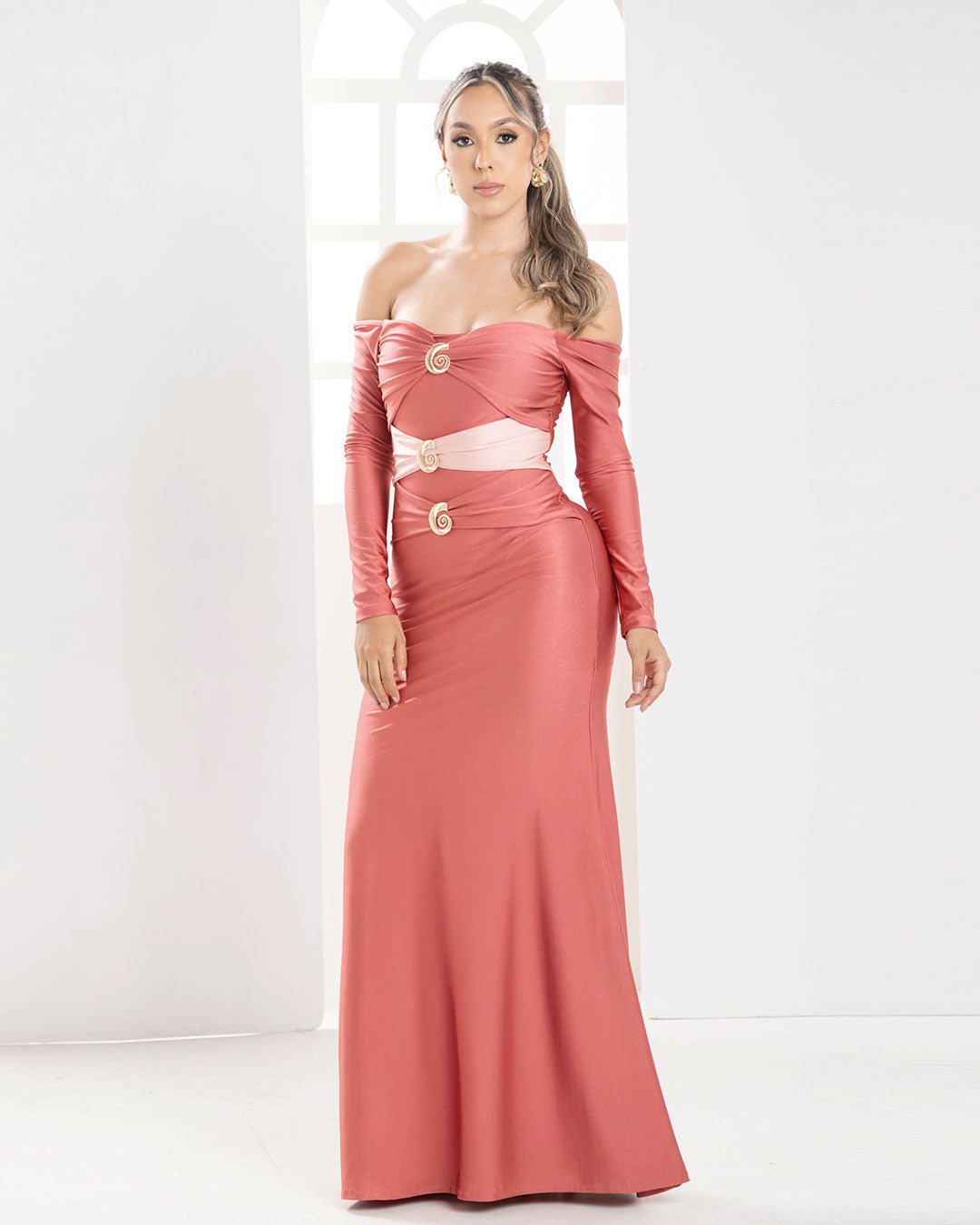 Vestido: Tela Licra Destellante Color Ocre Diseño elegante Escote tipo bandeja Manga Larga Corte entallado...