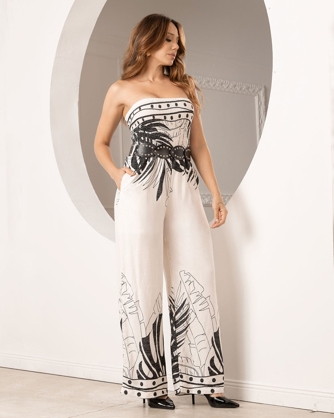 Enterizo: Tela Chalis suave y ligero Color Estampado Marfil Strapless sin tirantes Silueta amplia y...