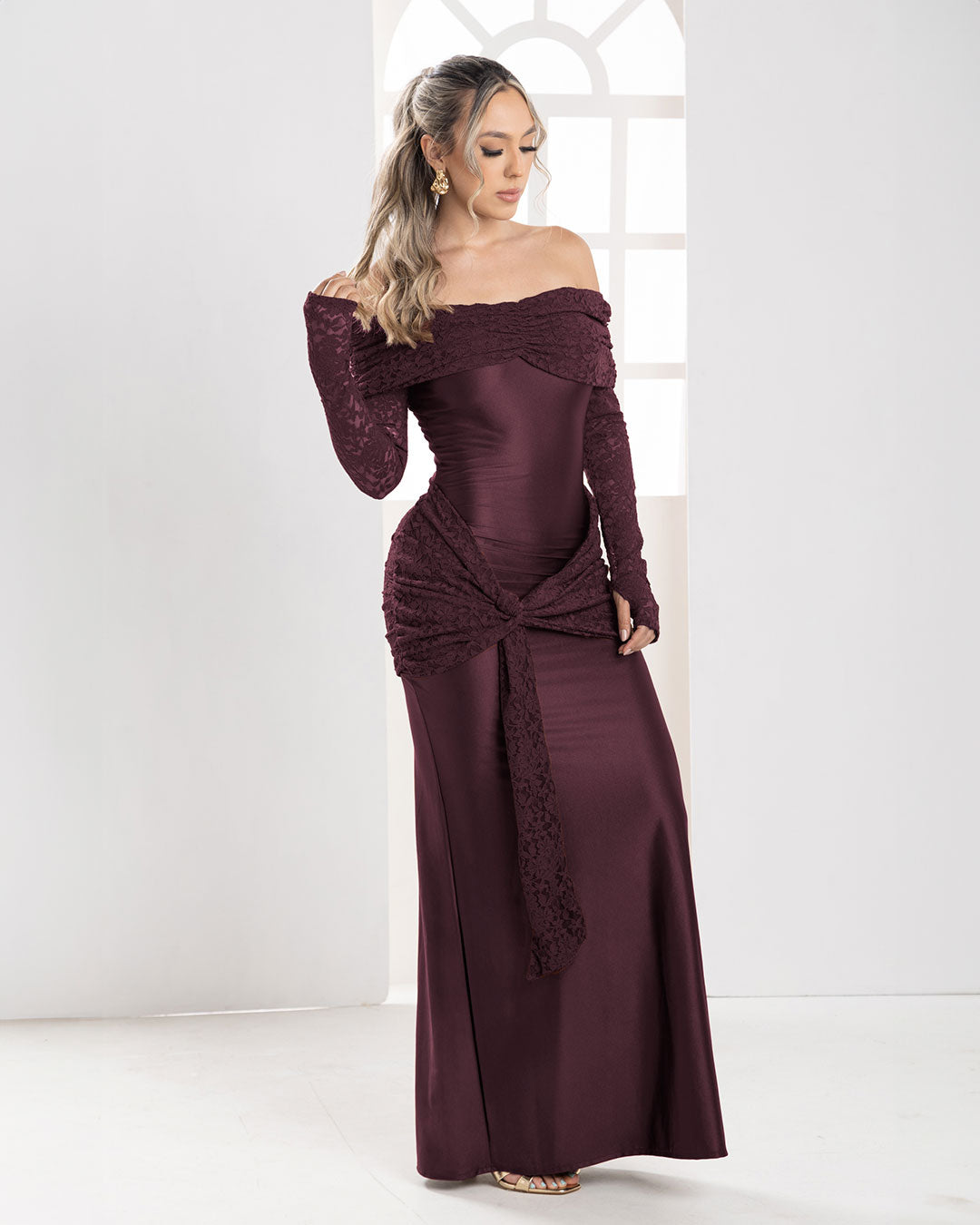 Vestido: Tela Blonda Color Vinotinto Vestido largo Escote bandeja con efecto drapeado. Manga larga ajustada...