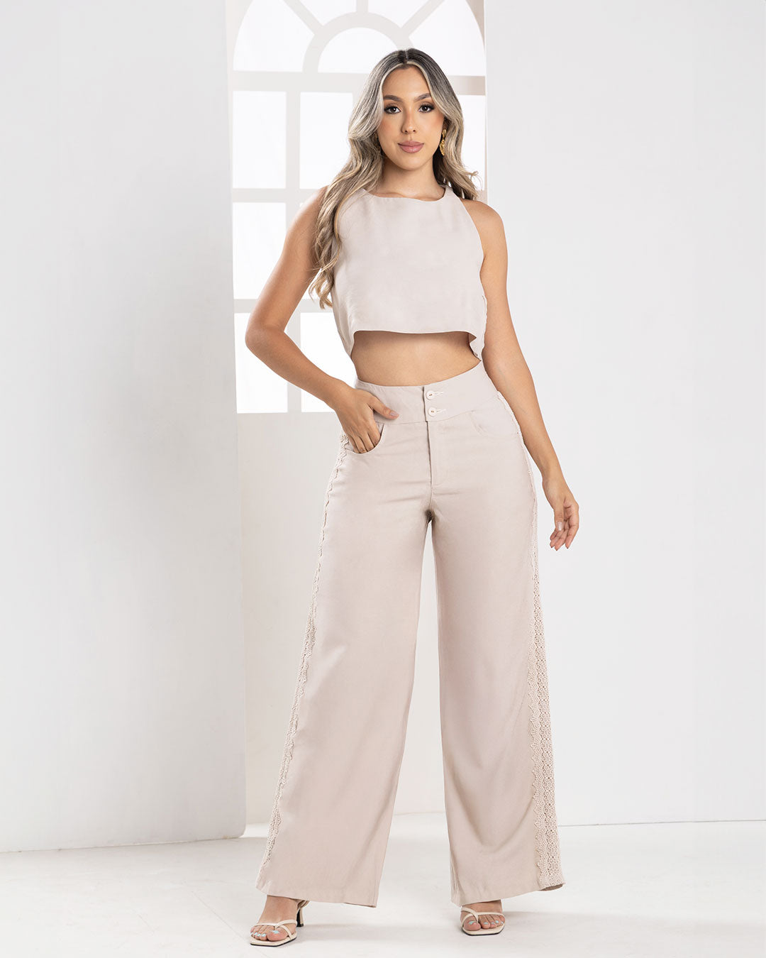 Blusa Crop top : Elaborado en tela Flow Color Camel Estilo Minimalista Pantalón: Color Camel...