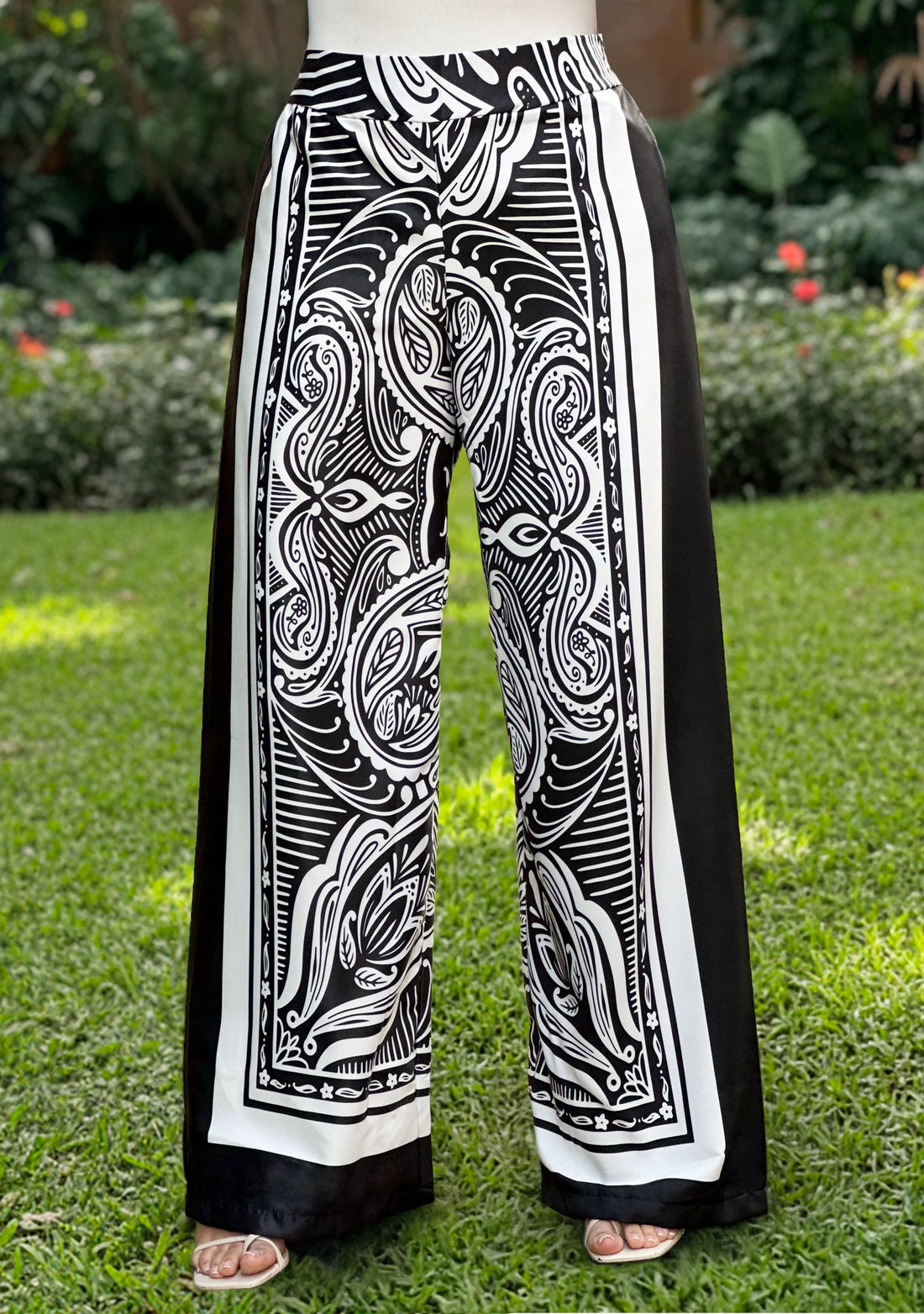 Pantalón: Tela plano satin mate Color Negro estampado Corte Amplio Tiro alto Cintura elástica en...