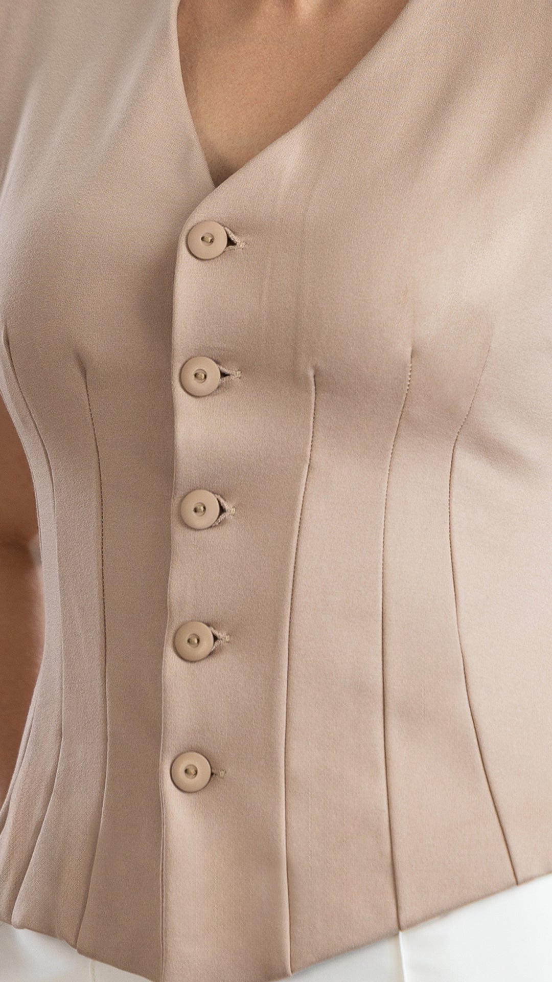 - Escote en V y cierre frontal con botones forrados del mismo tono