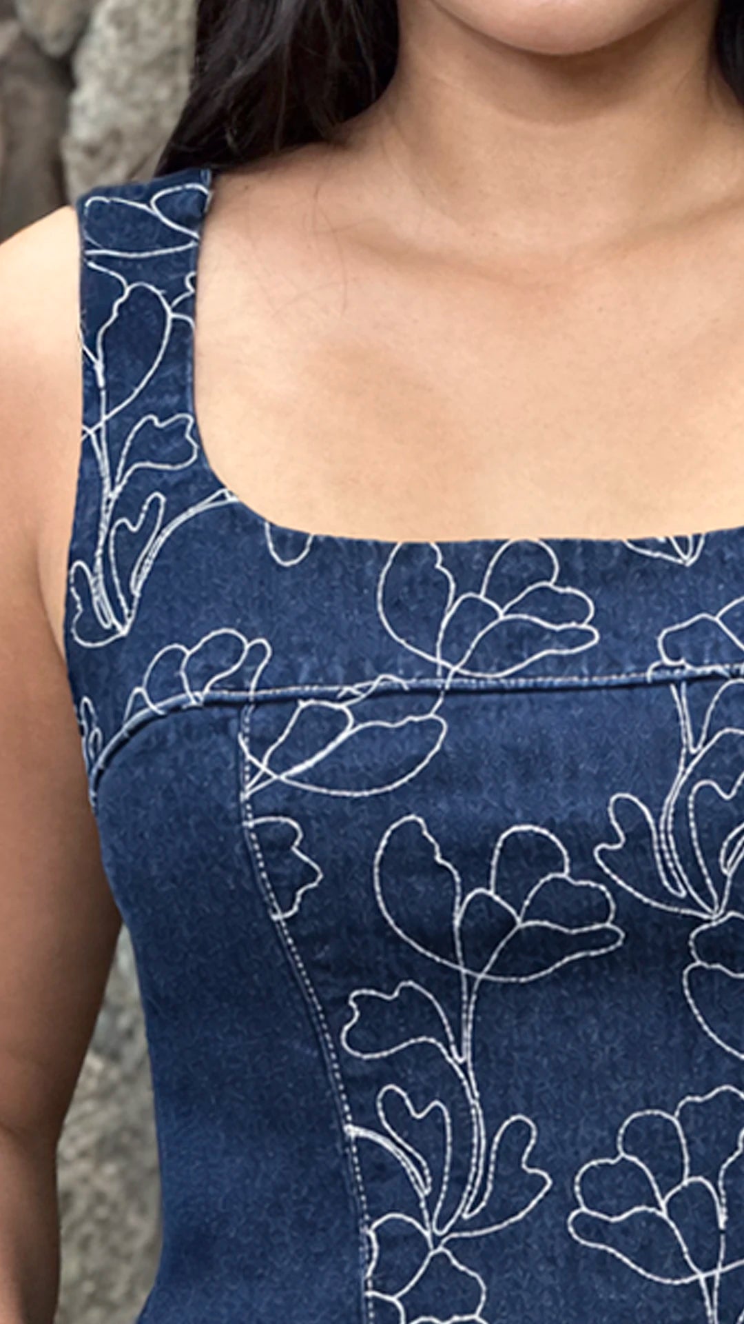 - Tono azul índigo con delicado bordado floral en contraste.