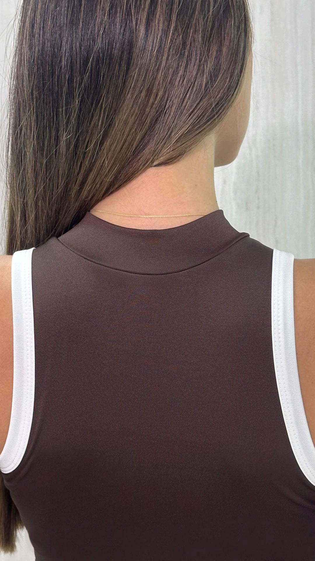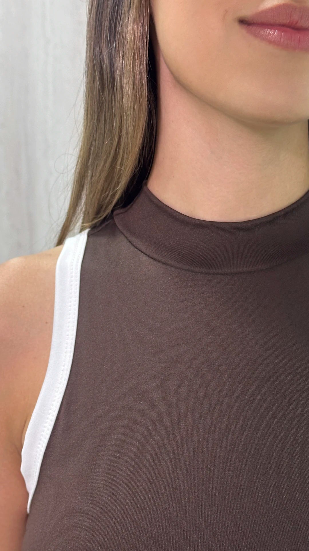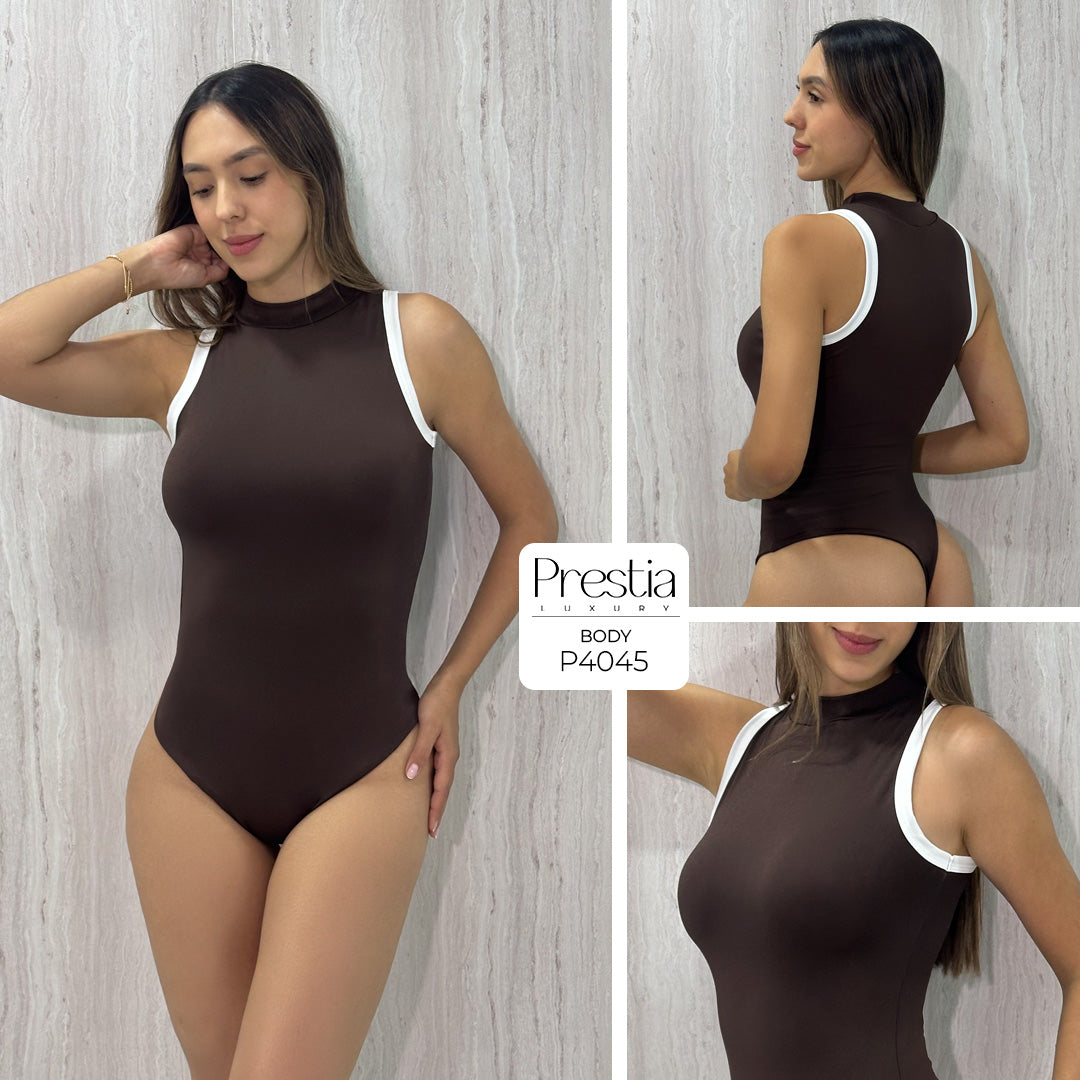 - Body sin mangas en color cafe con ribete contrastado marfil.