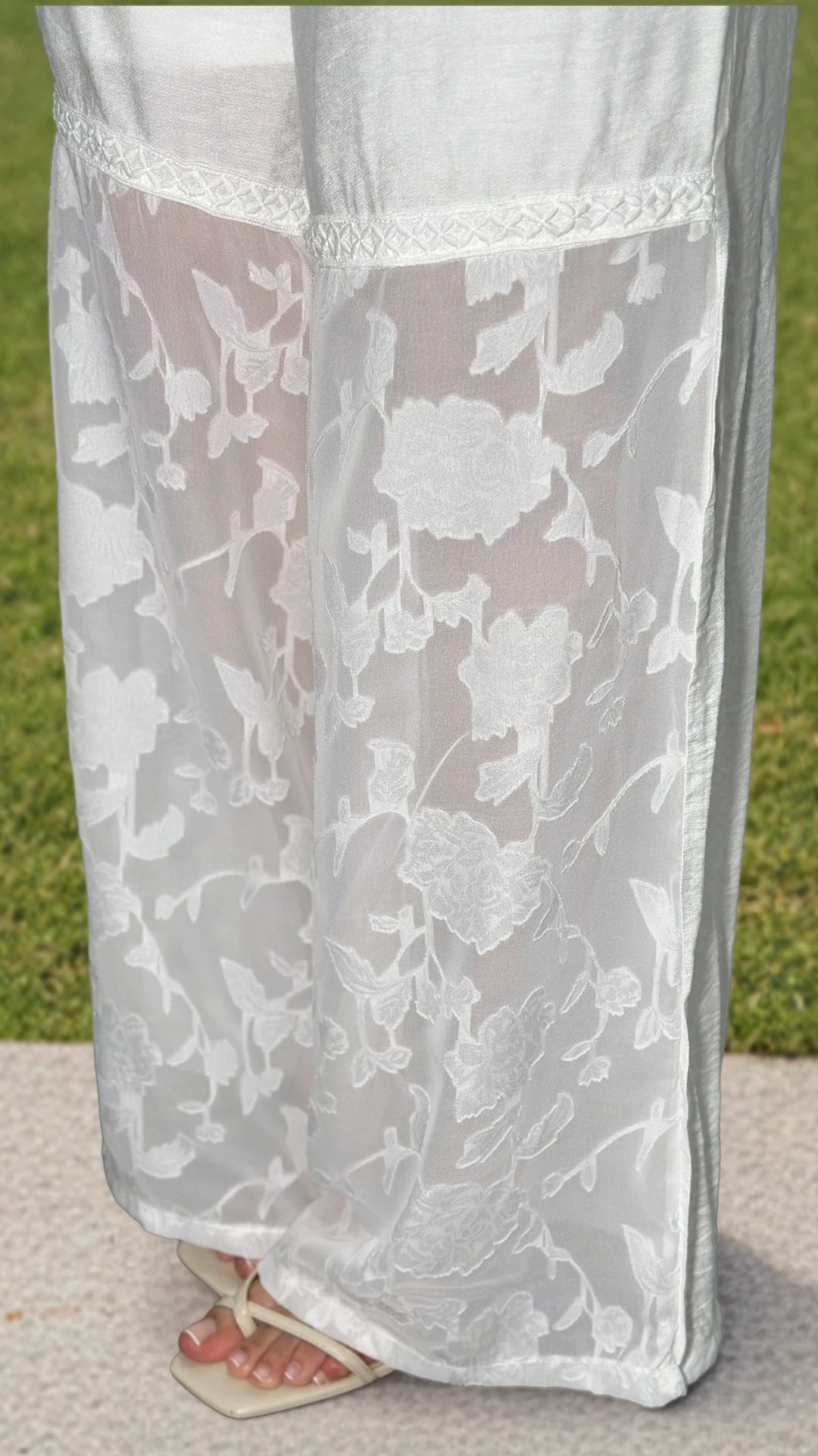 Paneles de encaje: Desde media pierna hasta el dobladillo, con motivos florales grandes, añadiendo un aire romántico y elegante.
