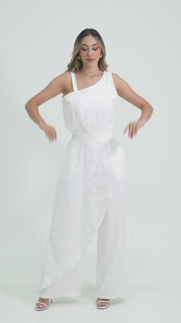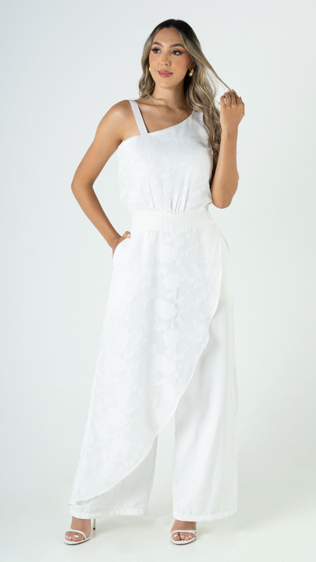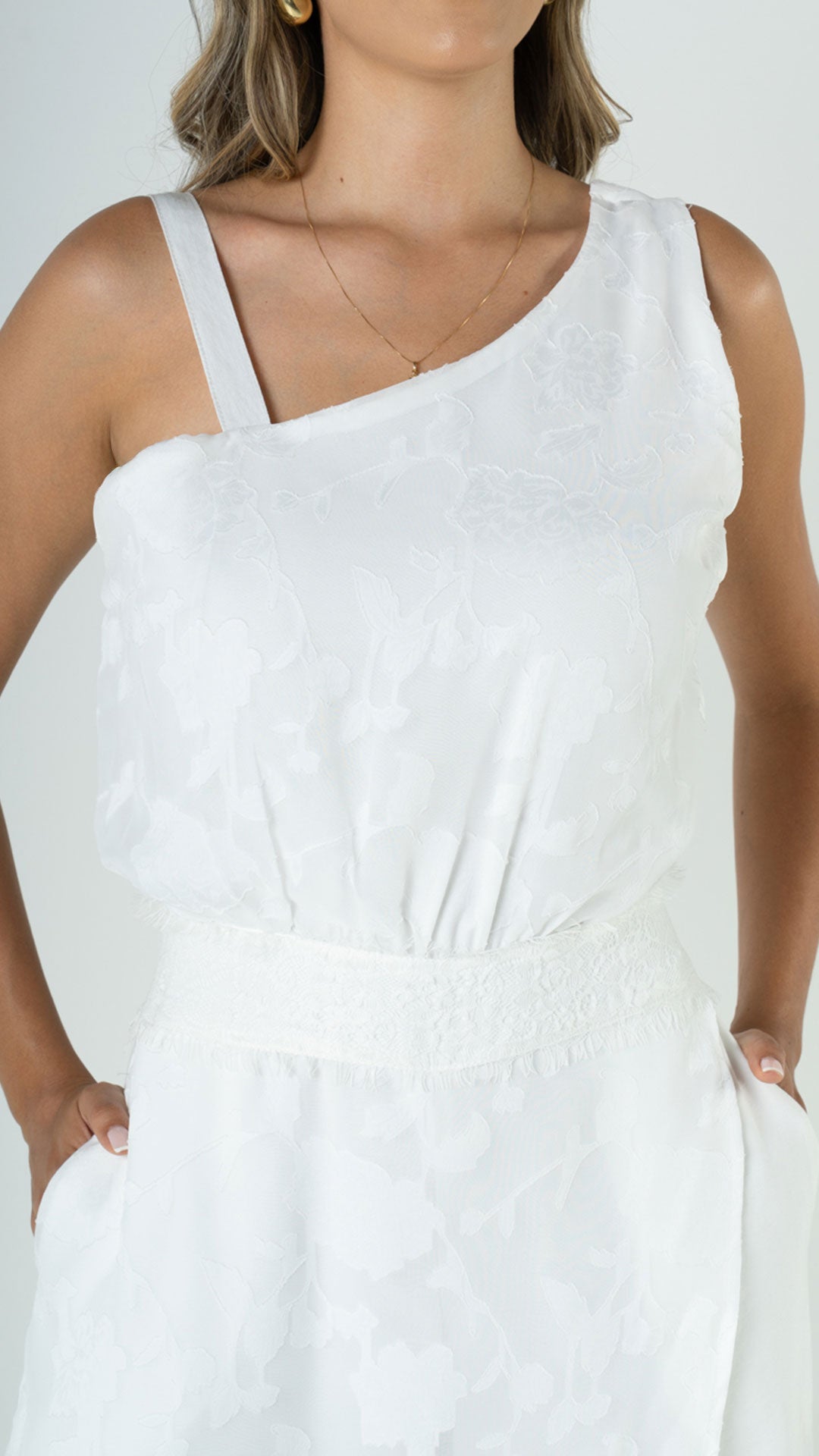 - Estampado floral en relieve (tonos blancos sobre blanco) que le añade textura sin perder elegancia monocromática.