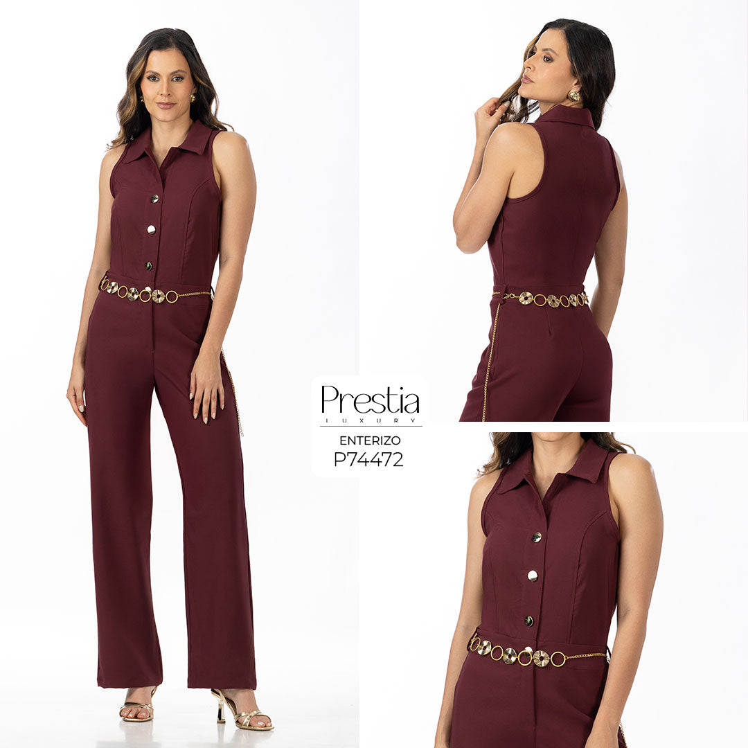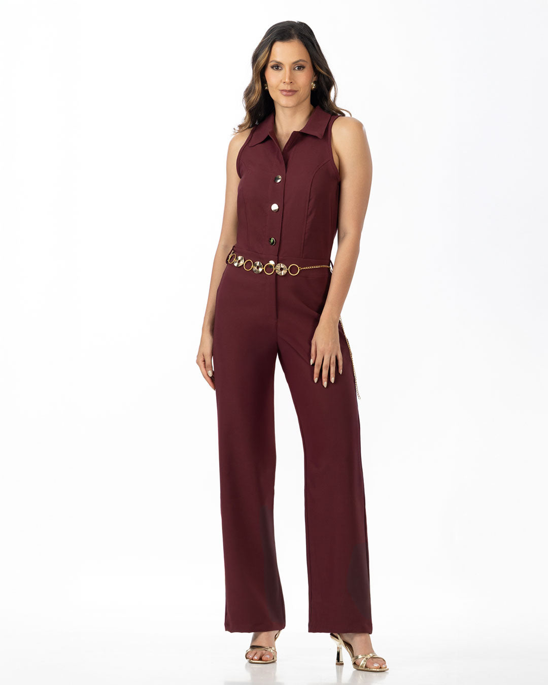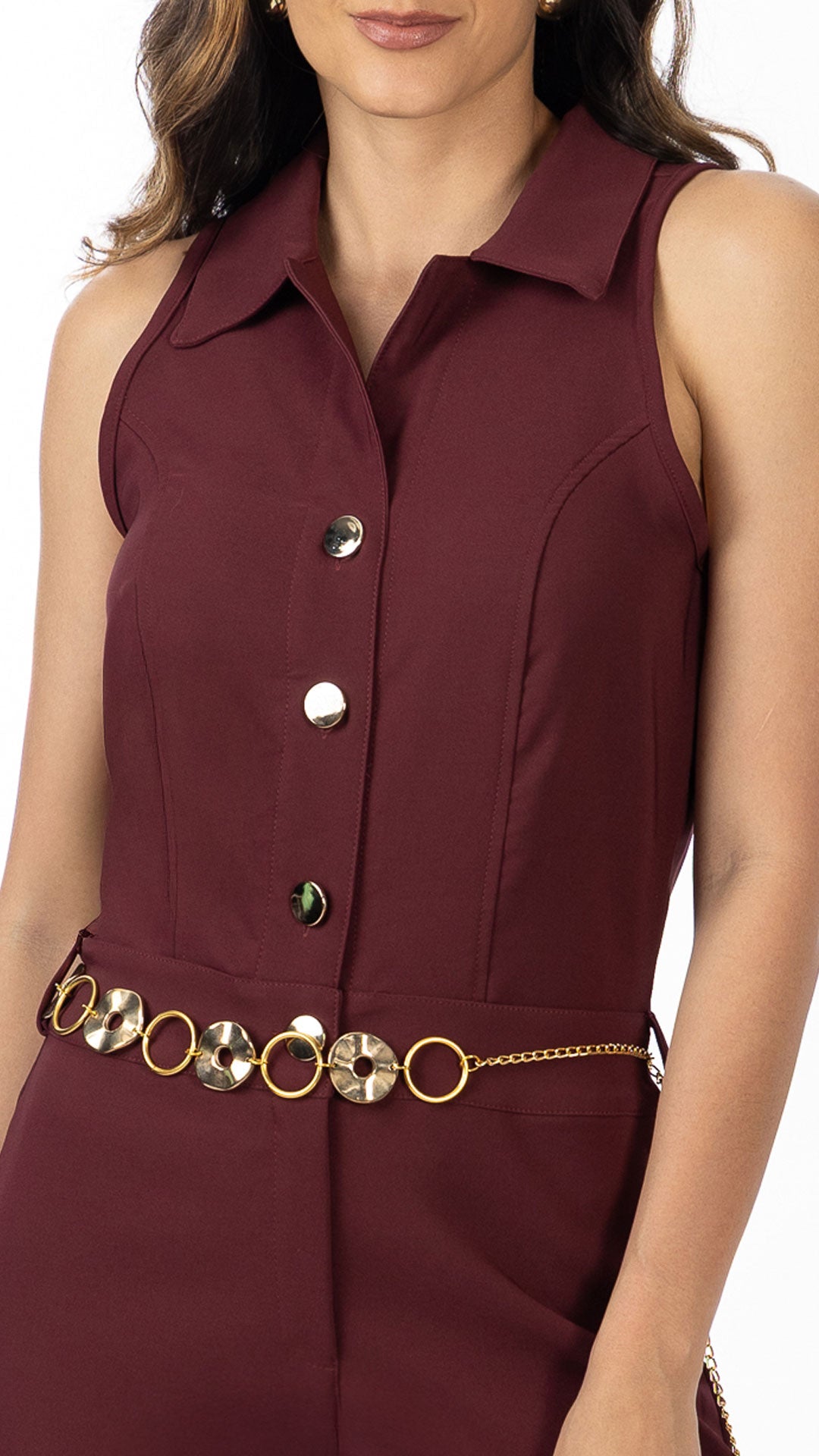Incluye cinturón tipo cadena dorada, un detalle llamativo que define la cintura y agrega glamour al conjunto.