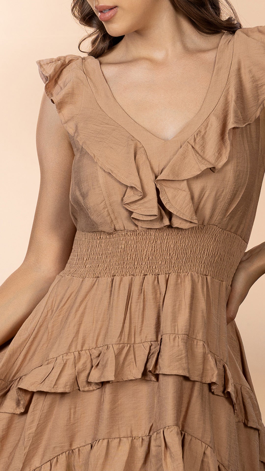 Diseño con escote en “V” y volantes decorativos en el pecho y la falda.