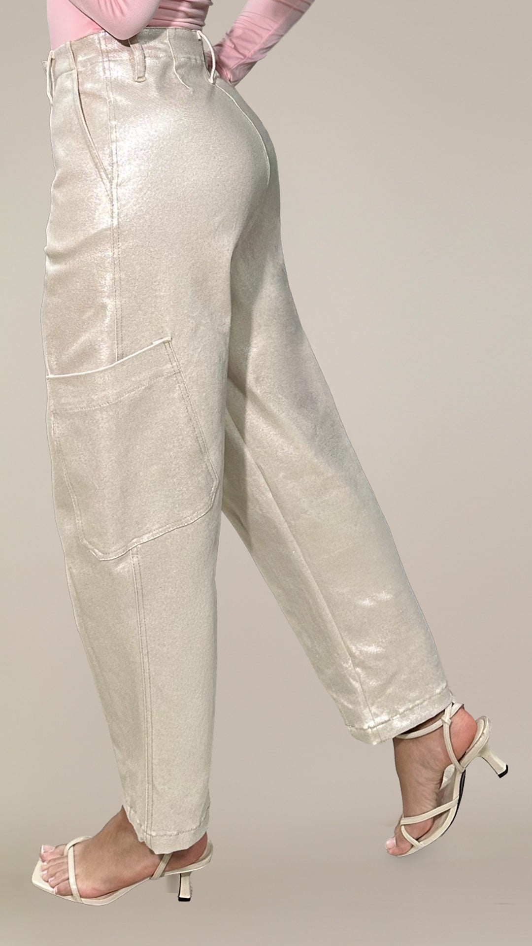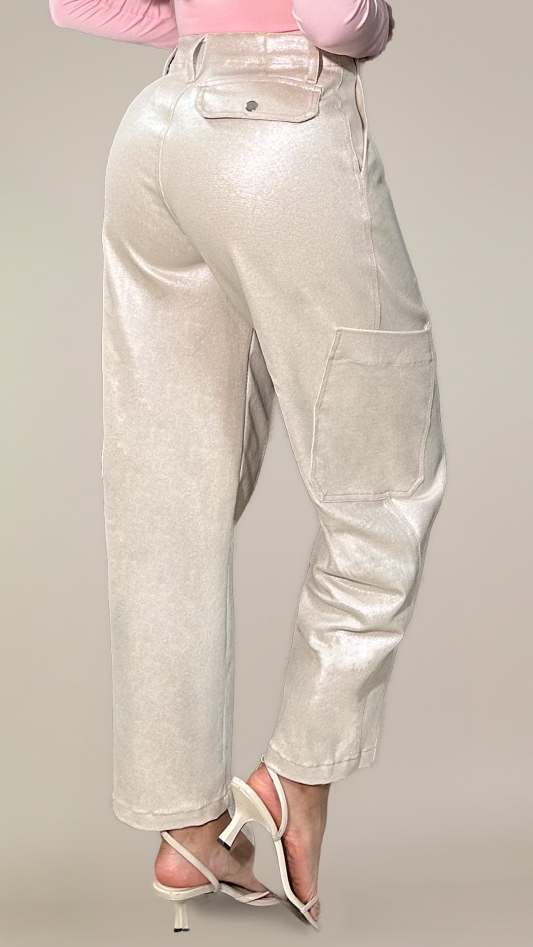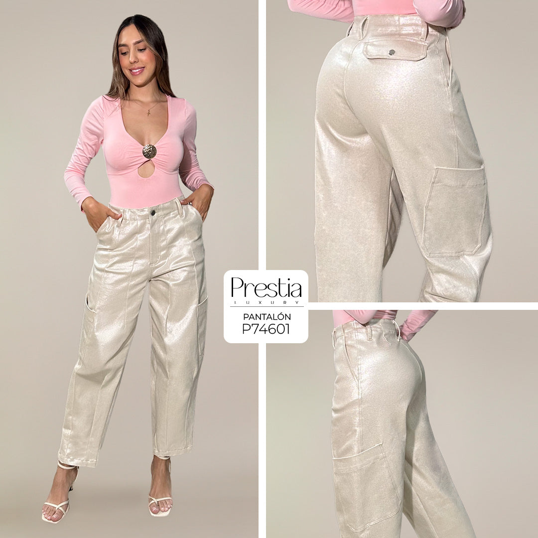 Un pantalón moderno y versátil, ideal para elevar cualquier look casual o de noche. Su acabado metalizado lo convierte en una pieza protagonista que combina perfecto con tops lisos, bodys o blusas estructuradas. Úsalo con tacones para un outfit llamativo y chic.