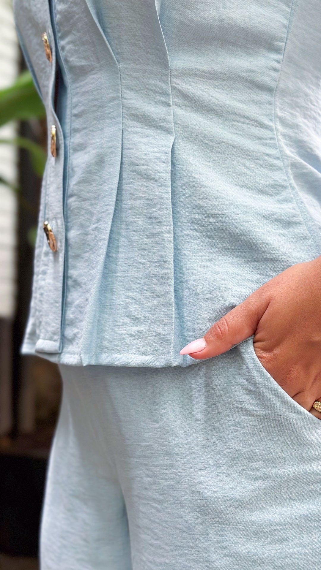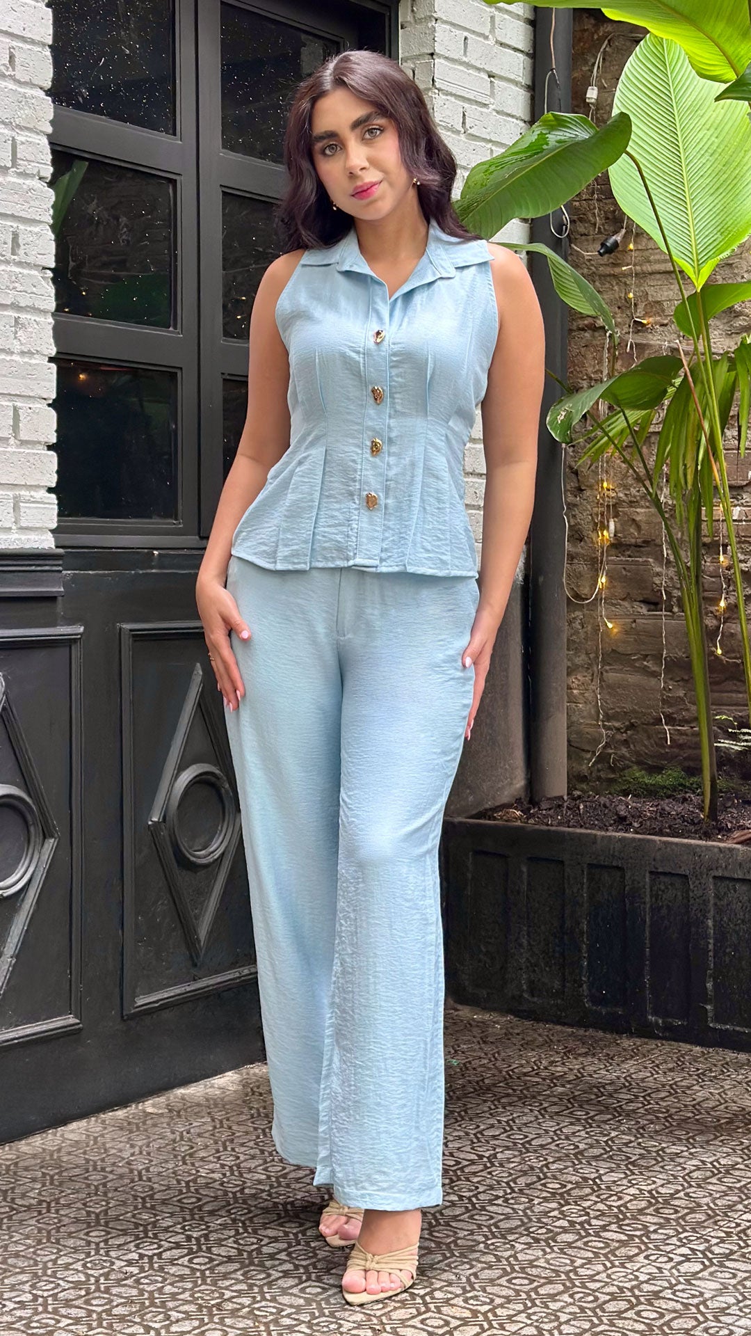 - Pantalón de tiro alto en tono azul suave.